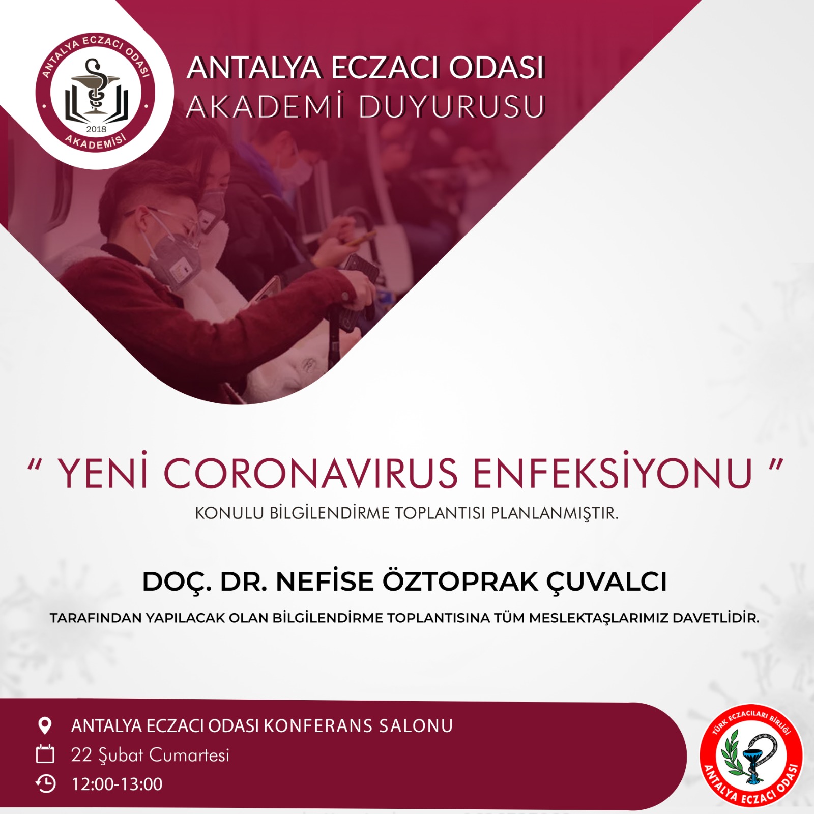 22/02/2020 Cumartesi günü Antalya Eczacı Odası Akademisi'nce "Yeni Coronavirus Enfeksiyonu" konulu bilgilendirme toplantısı planlanmıştır.