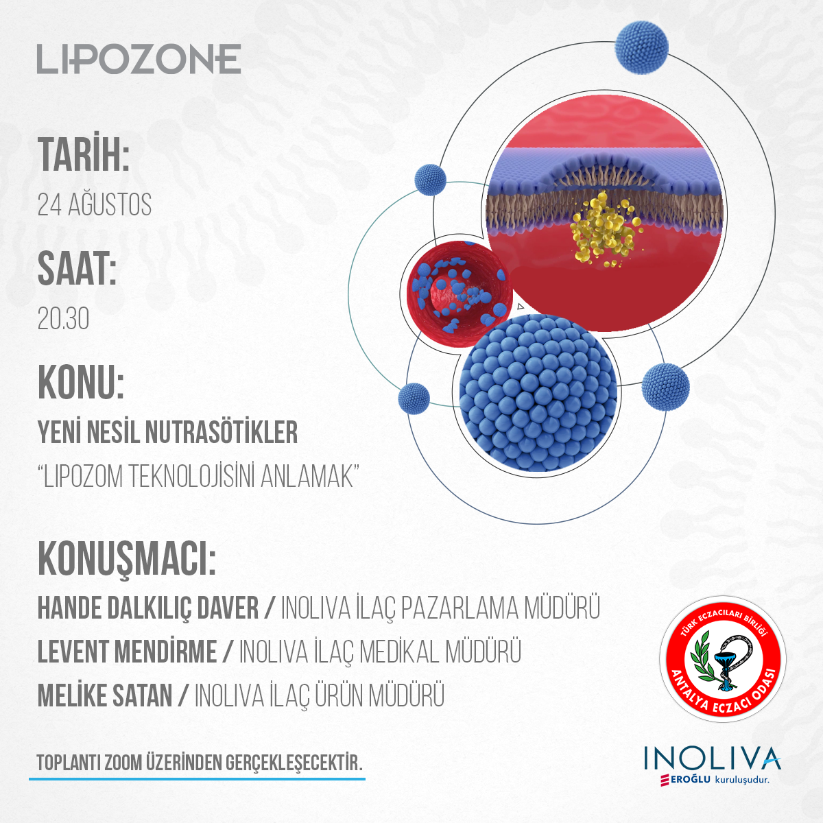 Odamızın online etkinlinlikleri Inoliva İlaç ile devam ediyor. 24 Ağustos Pazartesi günü saat 20.30'da Lipozom Teknolojisi ile üretilen Yeni Nesil Nutrasötikler hakkındaki online etkinliğe tüm meslektaşlarımız davetlidir. Toplantı ZOOM üzerinden online olarak yapılacaktır. Meslektaşlarımıza etkinlik günü yayından 1 saat önce ZOOM davet linki gönderilecektir.