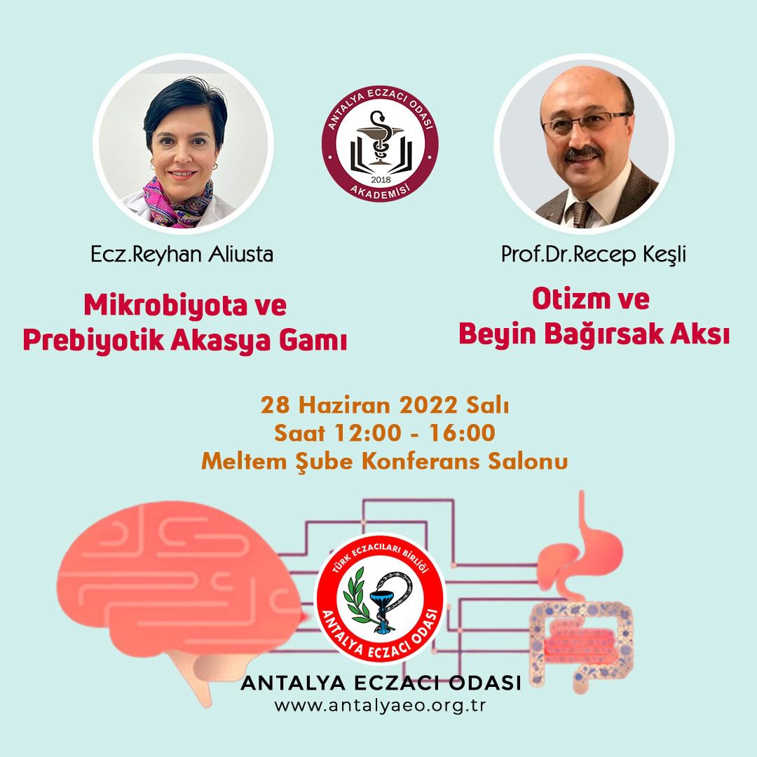 28 Haziran 2022 Salı günü Ecz. Reyhan Aliusta ile ‘'Mikrobiyota ve Prebiyotik Akasya Gamı'' ve Prof. Dr. Recep Keşli ile ‘'Otizm ve Beyin Bağırsak Aksı'' hakkındaki bilgilendirme toplantısına tüm meslektaşlarımız davetlidir.