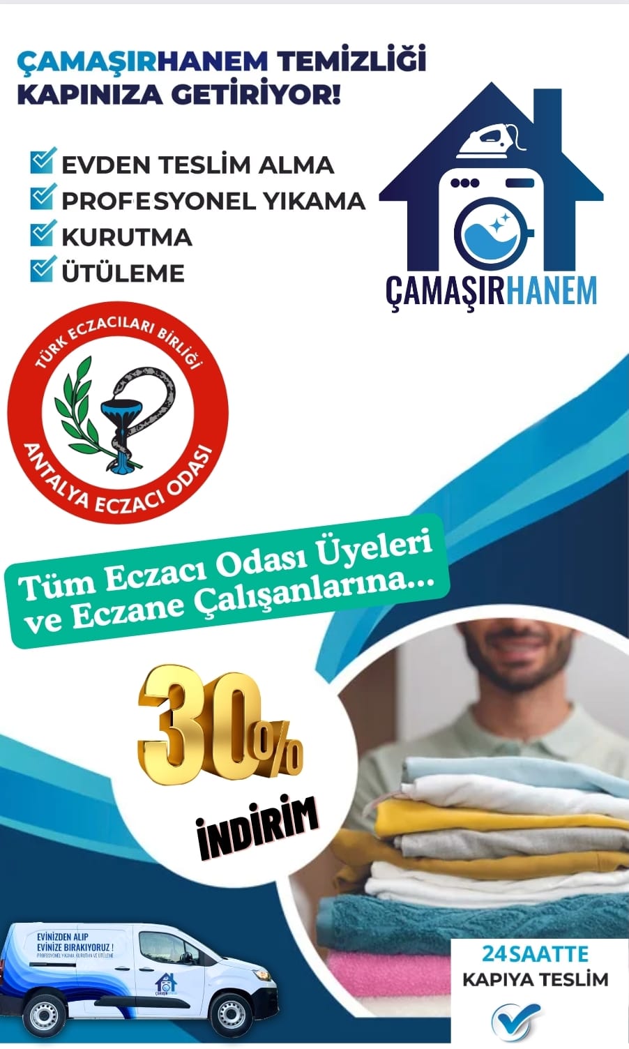 Odamız ile Çamaşırhanem firması iş birliği kapsamında imzalanan protokol ile Antalya Eczacı Odası üyeleri, Stajyerleri, personeli ve eczane çalışanlarına özel “Çamaşır yıkama, Kuru Temizleme ve Ütüleme” hizmetlerinde %30 indirim sağlanmıştır.