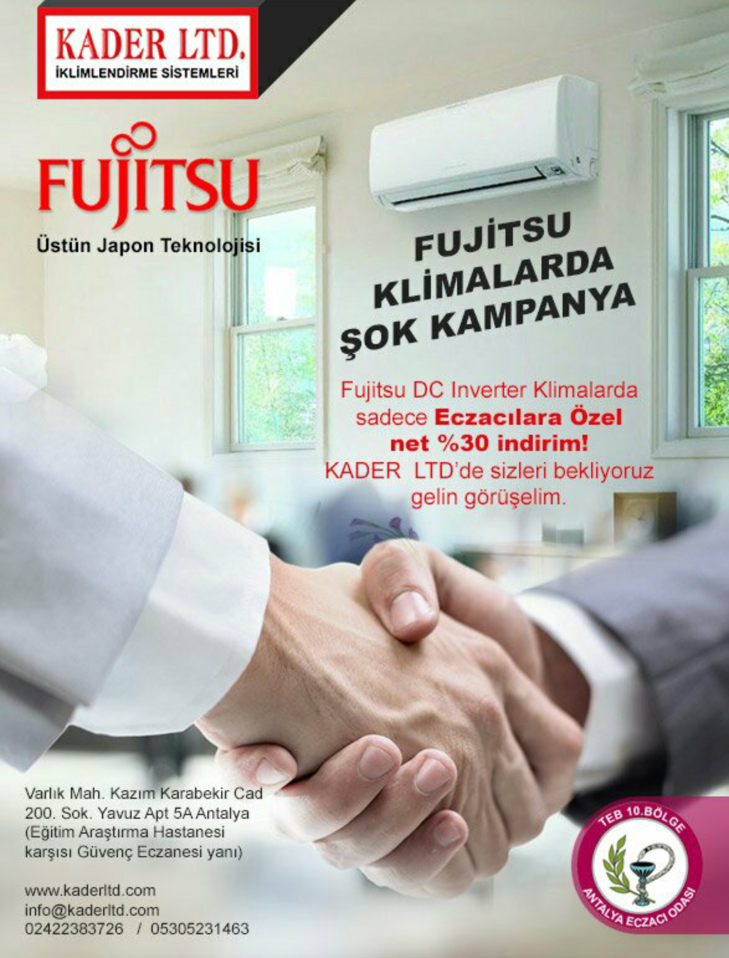 KADER LTD. İKLİMLENDİRME SİSTEMLERİ TARAFINDAN FUJITSU KLİMALARDA MESLEKTAŞLARIMIZA ÖZEL NET %30 İNDİRİM KAMPANYASI DÜZENLENMİŞTİR.