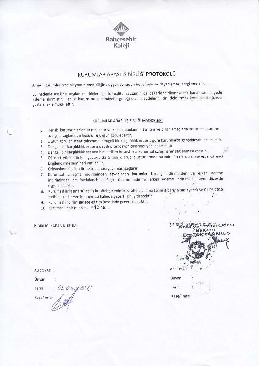 Odamızın Özel Bahçeşehir Koleji ile yapmış olduğu protokole istinaden meslektaşlarımıza özel %15 Kurumsal indirim sağlanmıştır.