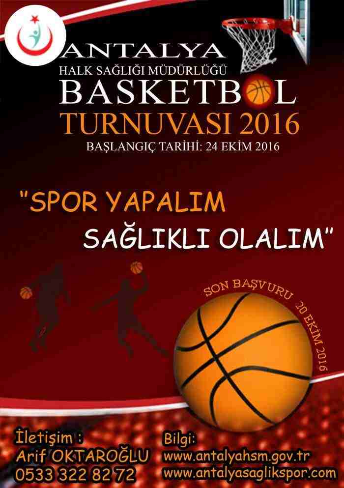 İlimiz Sağlık Çalışanlarının spor yaparak sağlıklı zaman geçirmeleri amacı ile Antalya Halk Sağlığı Müdürlüğü tarafından "Spor Yapalım Sağlıklı Olalım" temalı Basketbol (Streetball) Turnuvası düzenlenecektir.