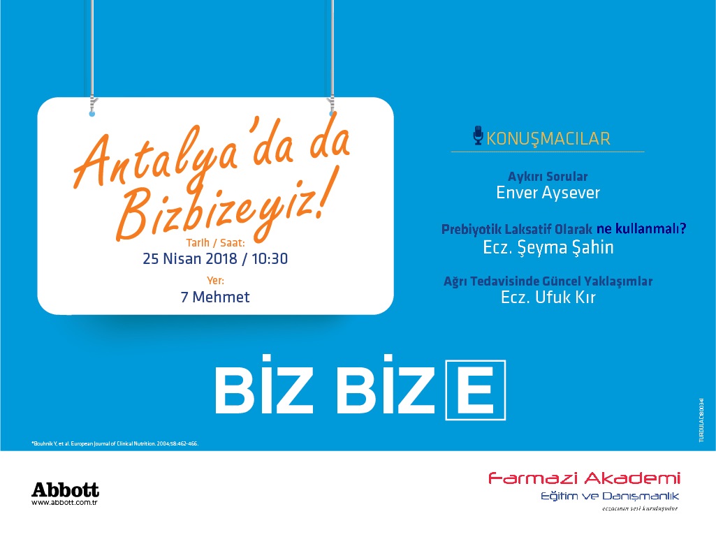 25 Nisan 2018 Çarşamba günü saat 10:30'da 7 Mehmet Restaurant'ta, Abbott İlaç Sponsorluğunda Farmazi Akademi Eğitim ve Danışmanlık tarafından Enver AYSEVER, Ecz. Şeyma ŞAHİN ve Ecz. Ufuk KIR'ın konuşmacı olarak katılacağı meslektaşlarımıza yönelik eğitim toplantısı düzenlenmiştir.