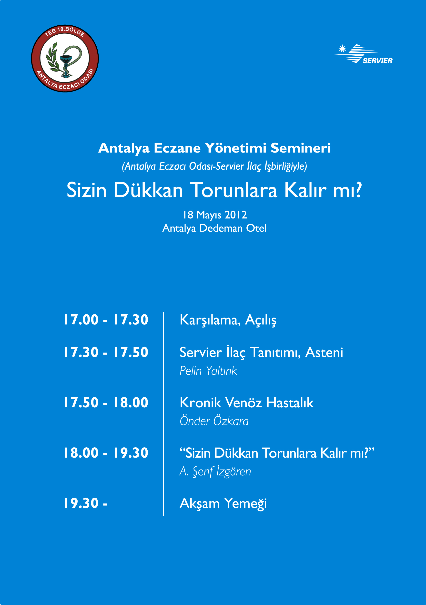 14 MAYIS ECZACILIK HAFTASI ETKİNLİKLERİ KAPSAMINDA A.ŞERİF İZGÖREN "SİZİN DÜKKAN TORUNLARA KALIR MI ?" KONULU ECZANE YÖNETİMİ SEMİNERİNE VE AKŞAM YEMEĞİNE KATILACAK MESLEKTAŞLARIMIZIN 16 MAYIS SAAT 17:00 YE KADAR ODA SEKRETERYASINA İSİMLERİNİ YAZDIRMALARI GEREKMEKTEDİR.