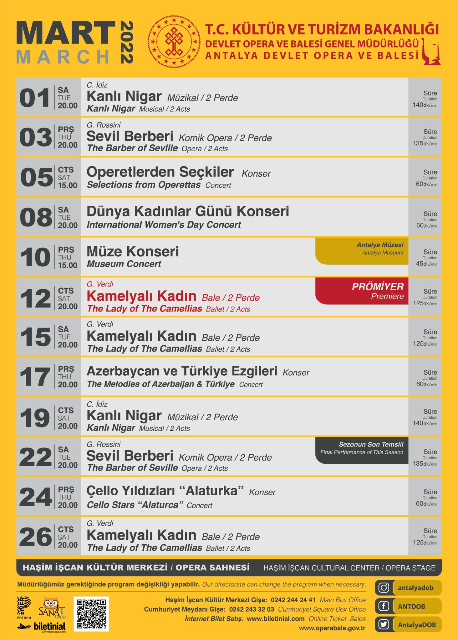 ANTALYA DEVLET OPERA VE BALESİ TARAFINDAN SAHNELENECEK MART AYI PROGRAMI EKTEDİR.