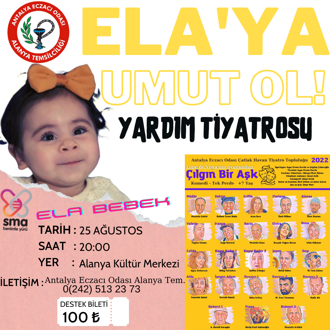 Geliri Ela Bebeğin kampanyasına bağışlanmak üzere Antalya Eczacı Odası Çatlak Havan Tiyatro Topluluğu tarafından "Çılgın Bir Aşk" isimli Oyunumuz 25 Ağustos 2022 Perşembe günü saat 20.00'da Alanya Kültür Merkezi'nde sahnelenecektir.