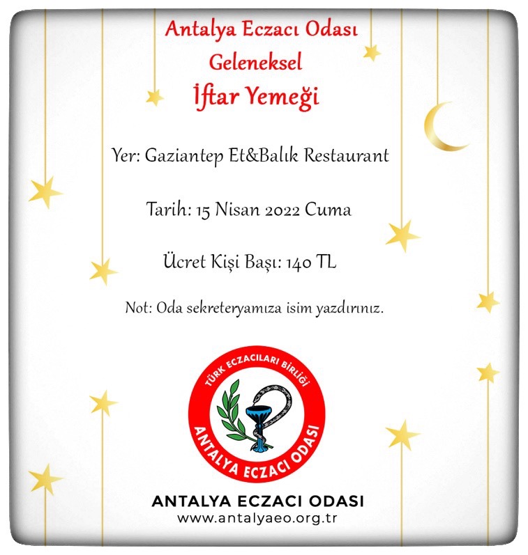 15 Nisan 2022 Cuma günü Gaziantep Et&Balık Restaurant'da (Konyaaltı Caddesi Atatürk Parkı İçi Antalya) iftar yemeğimiz düzenlenmiştir. İftar menüsü ücreti 140 TL olup katılmak isteyen meslektaşlarımızın 14 Nisan 2022 Perşembe günü mesai bitimine kadar oda sekreteryalarına isimlerini yazdırmaları gerekmektedir.