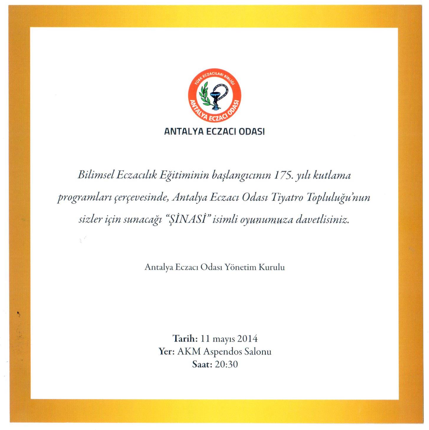 TİYATRO TOPLULUĞUMUZUN "ŞİNASİ" İSİMLİ OYUNU 11 MAYIS 2014 PAZAR GÜNÜ AKM ASPENDOS SALONU (CAM PİRAMİT YANI) SAAT 20:30 DA SERGİLENECEKTİR.