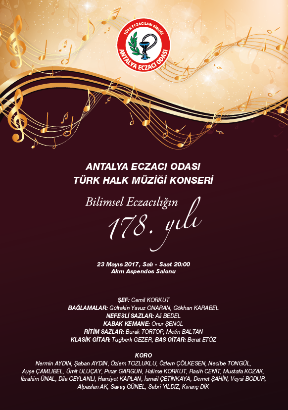 Antalya Eczacı Odası Türk Halk Müziği Korosunun gerçekleştireceği konser programı 23 Mayıs 2017 Salı günü Akm ASpendos Salonunda (Cam Piramit Yanı) Saat 20:00 da başlayacaktır.