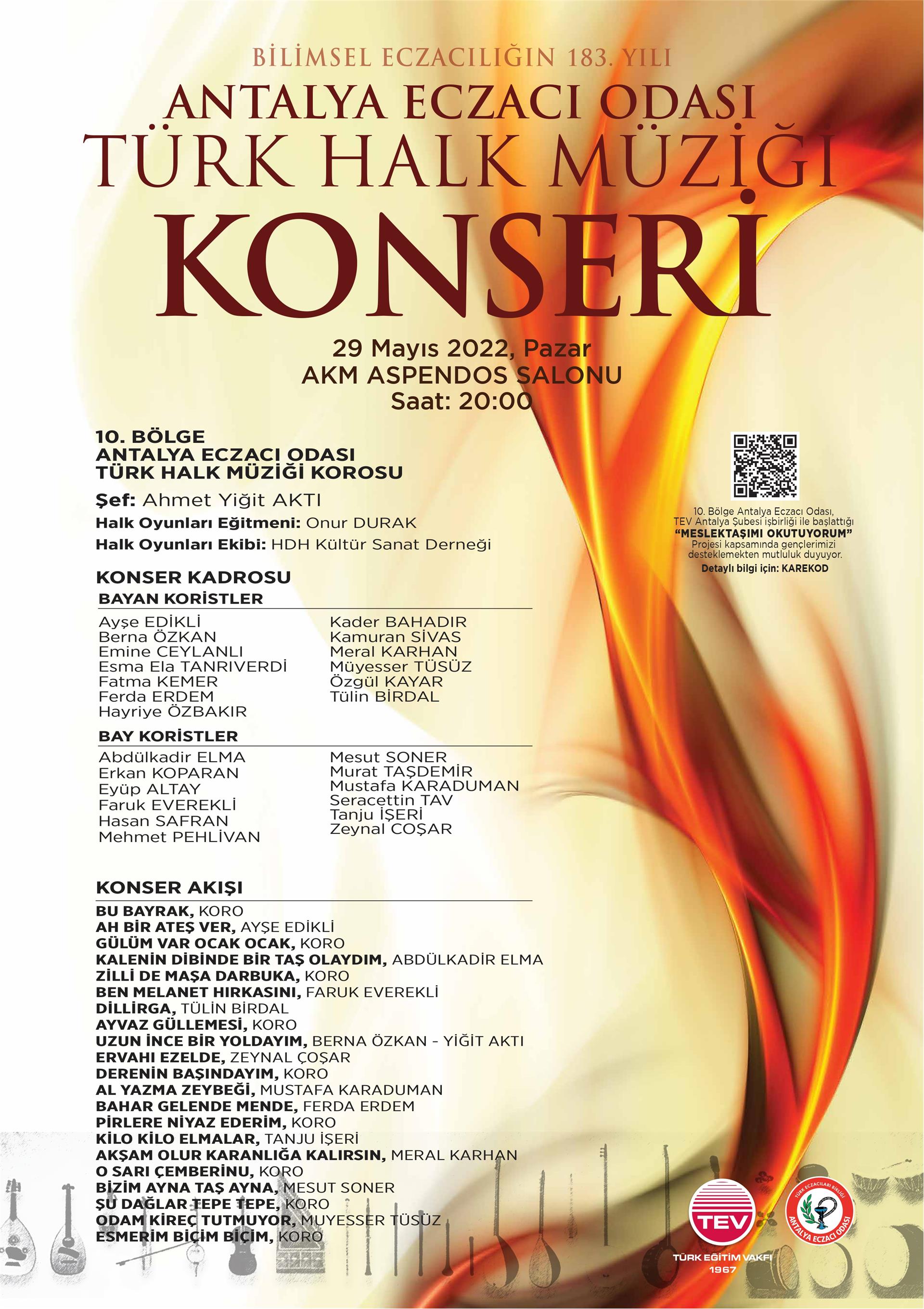 Antalya Eczacı Odası Türk Halk Müziği Korosu'nun gerçekleştireceği konser programı 29 Mayıs 2022 Pazar günü AKM Aspendos Salonu‘nda(Cam Piramit Yanı) Saat 20.00'de başlayacaktır.