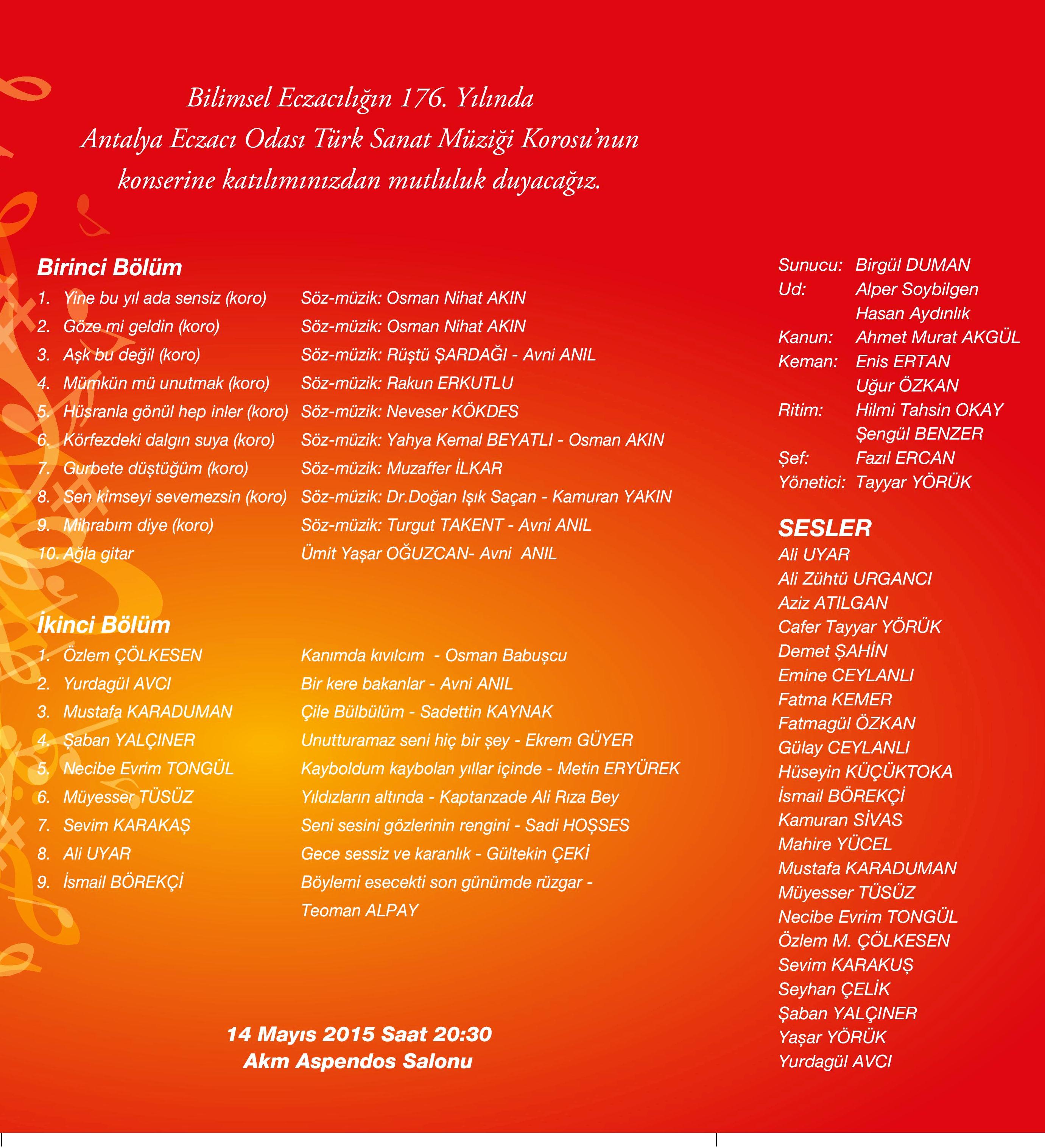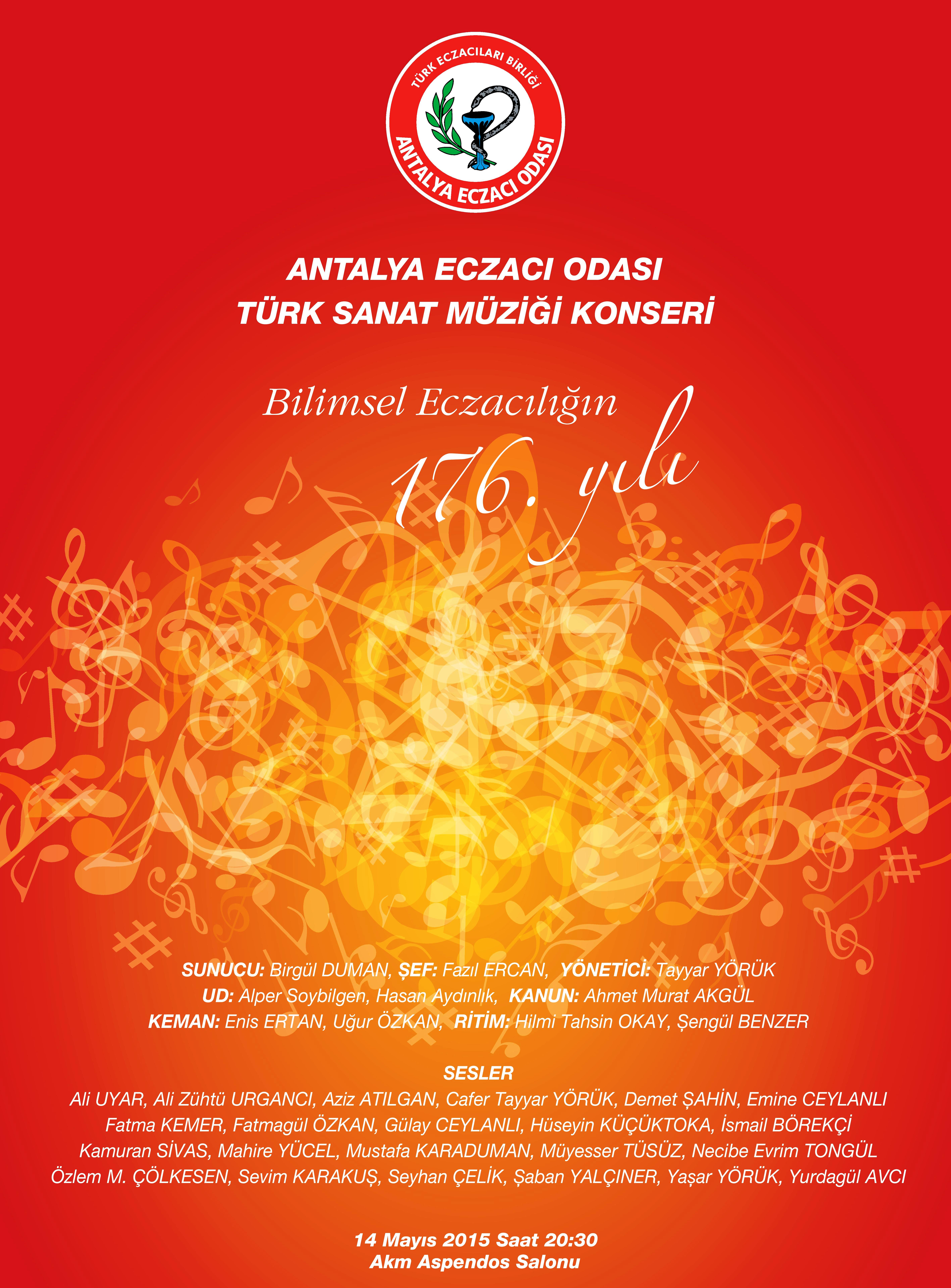 ANTALYA ECZACI ODASI TÜRK SANAT MÜZİĞİ KOROSUNUN GERÇEKLEŞTİRECEĞİ KONSER PROGRAMI 14 MAYIS 2015 PERŞEMBE GÜNÜ AKM ASPENDOS SALONUNDA (CAM PİRAMİT YANI) SAAT 20:30 DA BAŞLAYACAKTIR.