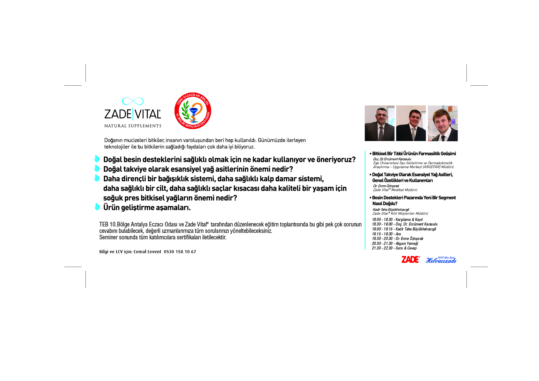 Antalya Eczacı Odası ve Zade Vital firması ile birlikte düzenlenen eğitim programı 21 Eylül 2013 Cumartesi günü saat 18:00 - 22:30 arası Akdeniz Üniversitesi Sosyal Tesisleri Akdeniz Üniversitesi Kampüsünde yapılacaktır. Katılacak olan meslektaşlarımızın Cuma günü saat 17:00' a kadar oda sekreteryalarımıza bildirmeleri gerekmektedir. Ayrıntılı bilgi ve eğitim programı ek dosyalardadır.
