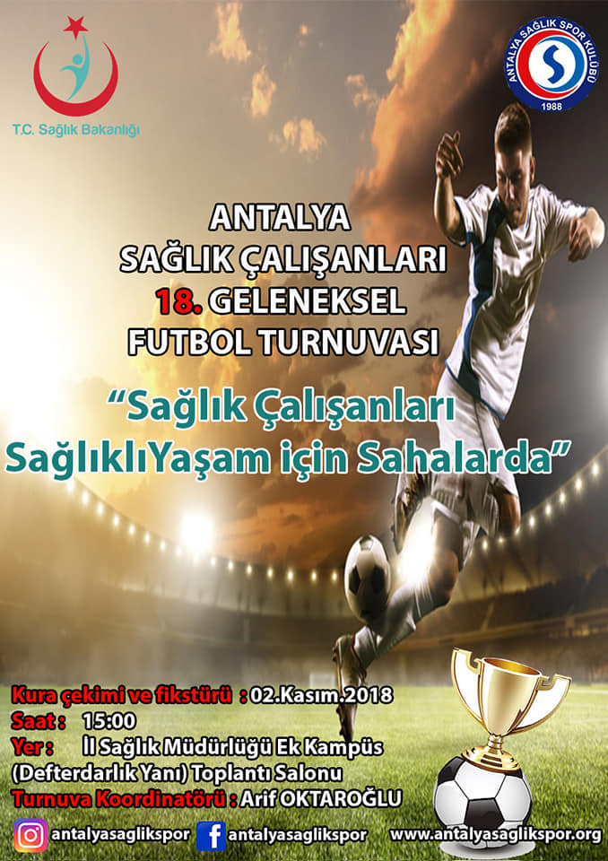 İlimiz sağlık çalışanlarının spor yaparak sağlıklı zaman geçirmeleri amacı ile Antalya Halk Sağlığı Müdürlüğü tarafından "Sağlık Çalışanları Sağlıklı Yaşam İçin Sahalarda" temalı Futbol Turnuvası düzenlenecektir.