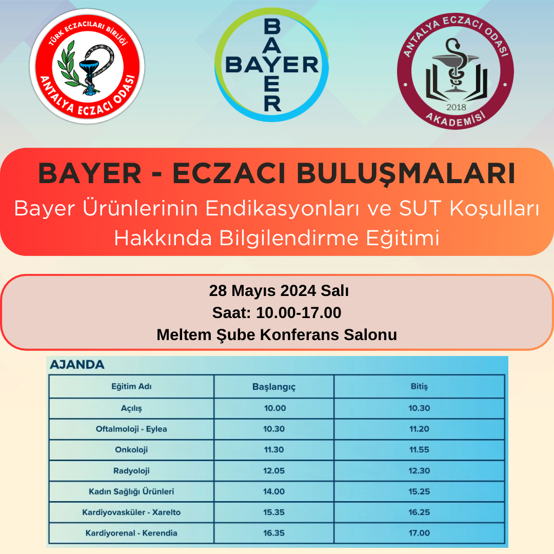 28 Mayıs 2024 Salı günü Meltem Şube toplantı salonumuzda 10:00-17:00 saatleri arasında Bayer Medikal ve Pazar Erişim ekibinin geri ödemelerle ilgili merak edilen tüm soruları cevaplayacağı “Bayer Ürünlerinin Endikasyonları ve SUT Koşulları” konulu eğitim düzenlenecektir.
