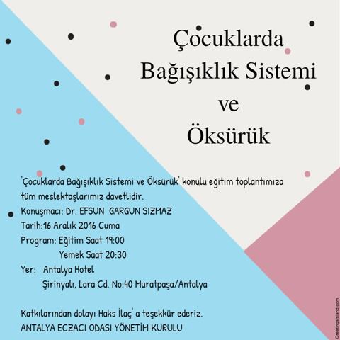 16 Aralık 2016 Cuma günü saat 19.00'da Odamız ve Haks İlaç işbirliğinde Antalya Hotel'de "Çocuklarda Bağışıklık Sistemi ve Öksürük" konulu bir eğitim programı düzenlenmiştir.