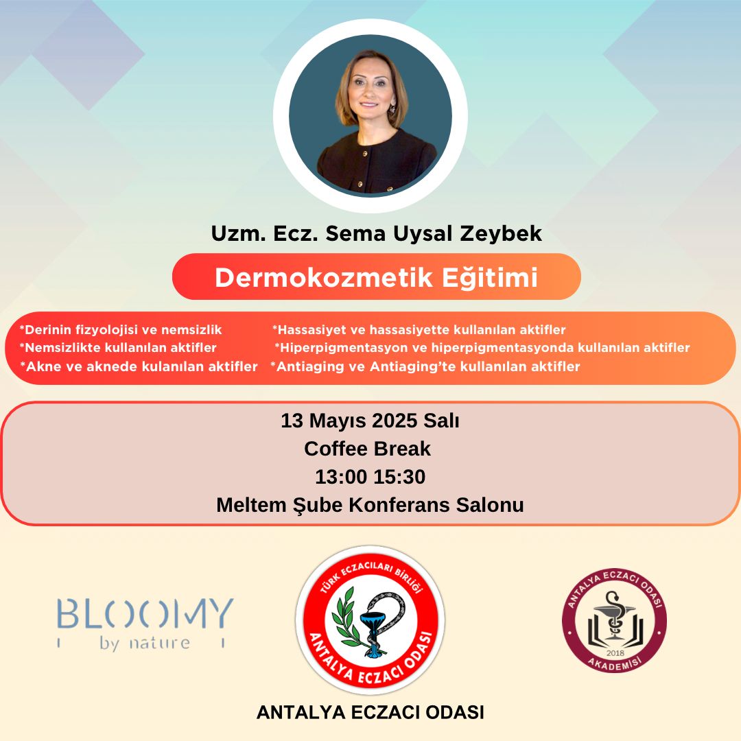 13 Mayıs 2025 Salı günü, Antalya Eczacı Odası Meltem Şube Toplantı Salonumuzda saat 13:00-15:30 saatleri arasında Akademimiz iş birliği ile düzenlenen “Dermokozmetik” eğitimi yapılacaktır.
