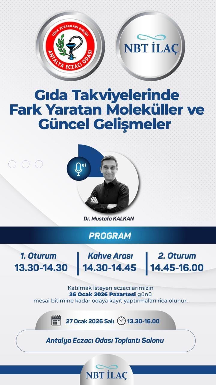 27 Ocak 2026 Salı günü, Antalya Eczacı Odası Meltem Şube Toplantı Salonumuzda saat 13:30-16:00 saatleri arasında NBT İlaç ve Akademimiz iş birliği ile düzenlenen ''Gıda Takviyelerinde Fark Yaratan Moleküller ve Güncel Gelişmeler'' eğitimi yapılacaktır.
