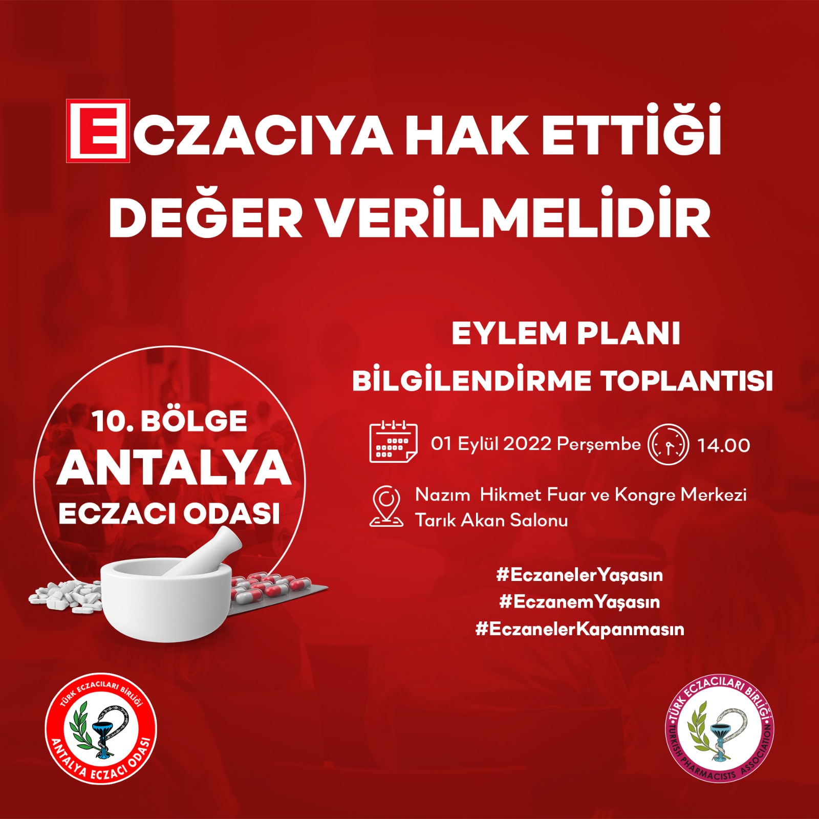 "Eczacıya Hak Ettiği Değer Verilmelidir" Eylem Planı Bilgilendirme Toplantısı, TEB Saymanımız Ecz. Tahir Özelçi, TEB Denetleme Kurulu Başkanımız Ecz. Oğuzhan Ulutaş, TEB Merkez Heyeti Üyesi Ecz. Uğur Elik, TEB Merkez Heyeti Üyemiz Ecz. Fehmi Onur Özgüven'in katılımıyla, 1 Eylül Perşembe günü saat 14.00'de Nazım Hikmet Fuar ve Kongre Merkezi Tarık Akan Salonu'nda yapılacaktır.