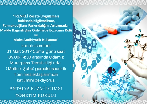 31 Mart 2017 Cuma günü 09.00-14.30 saatleri arasında Odamız Muratpaşa Temsilciliği'nde (Meltem Şube) ekte eğitim programı yer alan "Farmakovijilans Farkındalığını Artırmada, Madde Bağımlılığını Önlemede Eczacının Rolü ve Akılcı Antibiyotik Kullanımı" konulu seminer düzenlenmiştir.