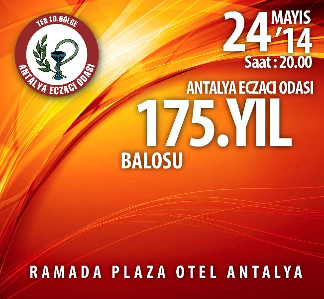 BİLİMSEL ECZACILIĞIN 175. YILDÖNÜMÜ NEDENİ İLE DÜZENLENMİŞ OLAN "GELENEKSEL ECZACILIK BALOSU" 24 MAYIS 2014 CUMARTESİ GÜNÜ SAAT 20:00' DA RAMADA PLAZA ANTALYA' DA GERÇEKLEŞECEKTİR. BİLETLER KİŞİ BAŞI 95 TL OLUP, ODA SEKRETERYALARIMIZDAN TEMİN EDİLEBİLECEKTİR.