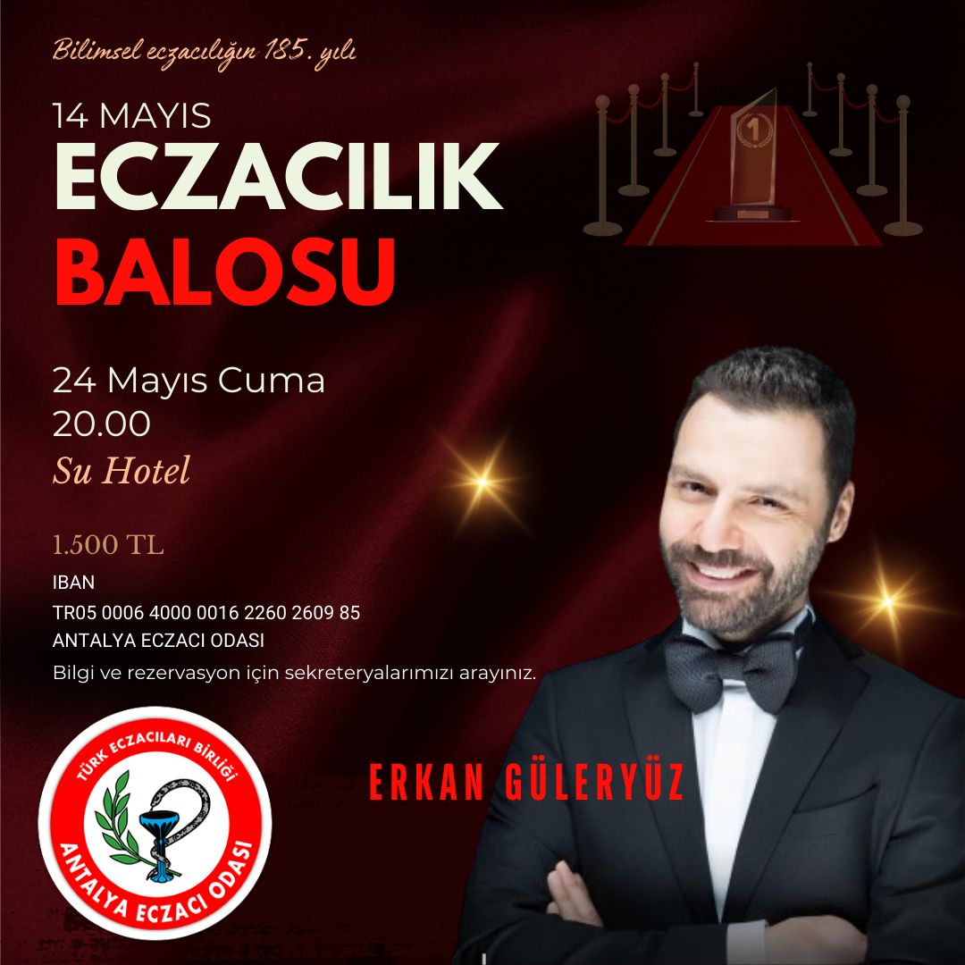 Bilimsel eczacılığın 185. yıl dönümü nedeni ile düzenlenmiş olan "Geleneksel Eczacılık Balosu" 24 Mayıs 2024 Cuma günü saat 20.00' da Su Hotel Antalya 'da gerçekleşecektir.