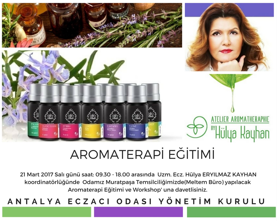 21 Mart 2017 Salı günü saat: 09.30 - 18.00 arasında Uzm. Ecz. Hülya ERYILMAZ KAYHAN koordinatörlüğünde Odamız Muratpaşa Meltem Şubesi'nde Aromaterapi Eğitimi ve Workshop' u yapılacaktır.