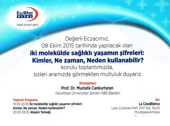 08 Ekim 2015 Perşembe günü saat 19.30'da Hacettepe Üniversitesi Geriatri ABD Başkanı Prof. Dr. Mustafa CANKURTARAN'ın konuşmacı olarak katılacağı "İki Molekülde Sağlıklı Yaşamın Şifreleri: Kimler, Ne Zaman, Neden Kullanabilir?" konulu eğitim toplantısı Odamız Sosyal Tesisi La Casablanca Bistro'da yapılacaktır.