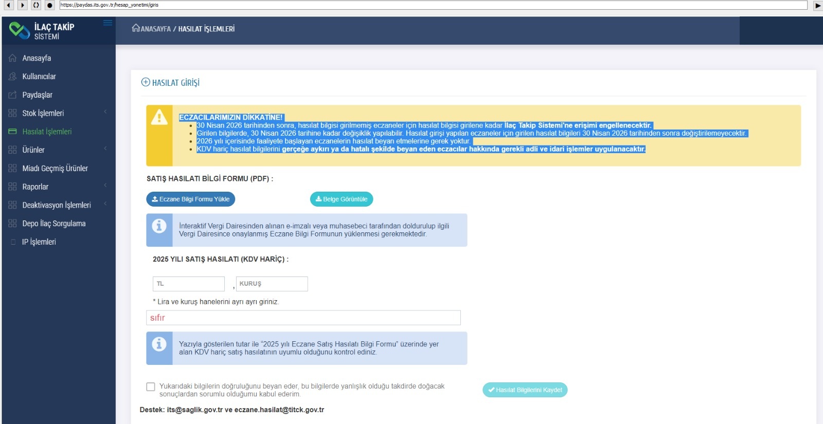İTS portal üzerinden hasılat girişleri için son tarih 30/04/2026'dır.