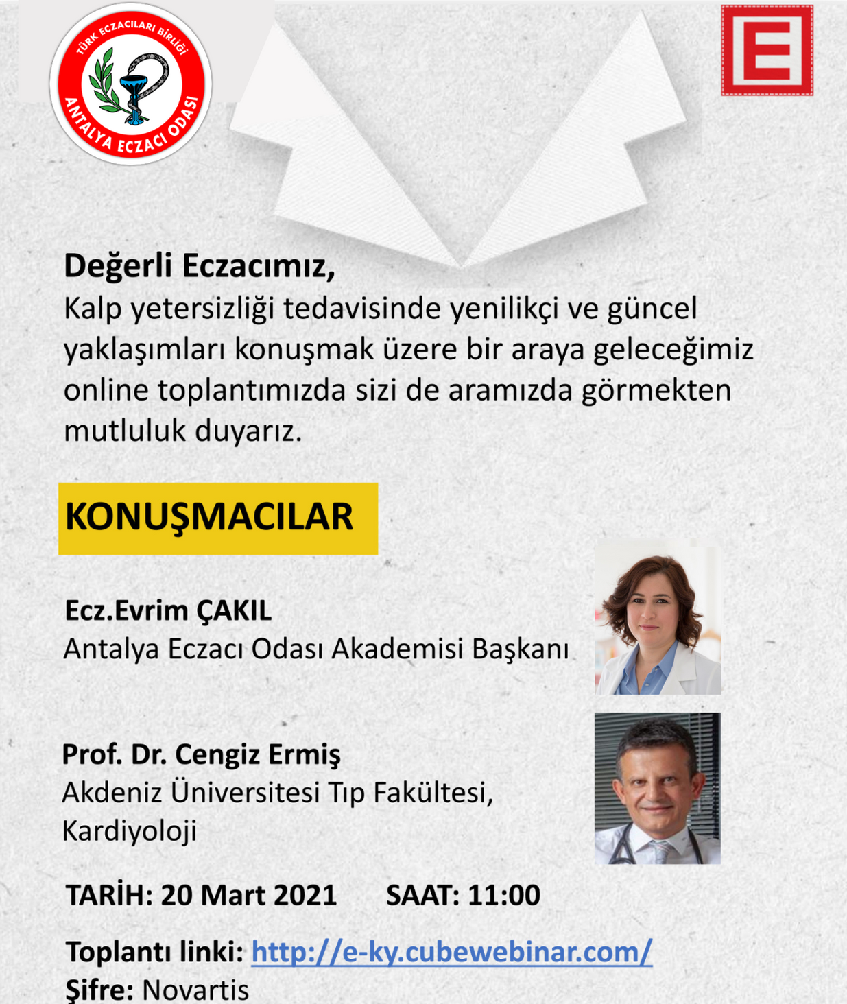 20 Mart 2021 Cumartesi günü saat 11:00' de Ecz. Evrim ÇAKIL moderatörlüğünde gerçekleşecek olan ‘'Kalp Yetersizliği Tedavisinde Yenilikçi ve Güncel Yaklaşımlar'' toplantısına konuşmacı olarak Akdeniz Üniversitesi Kardiyoloji Anabilim Dalı öğretim üyesi Prof. Dr. Cengiz ERMİŞ katılacaktır.