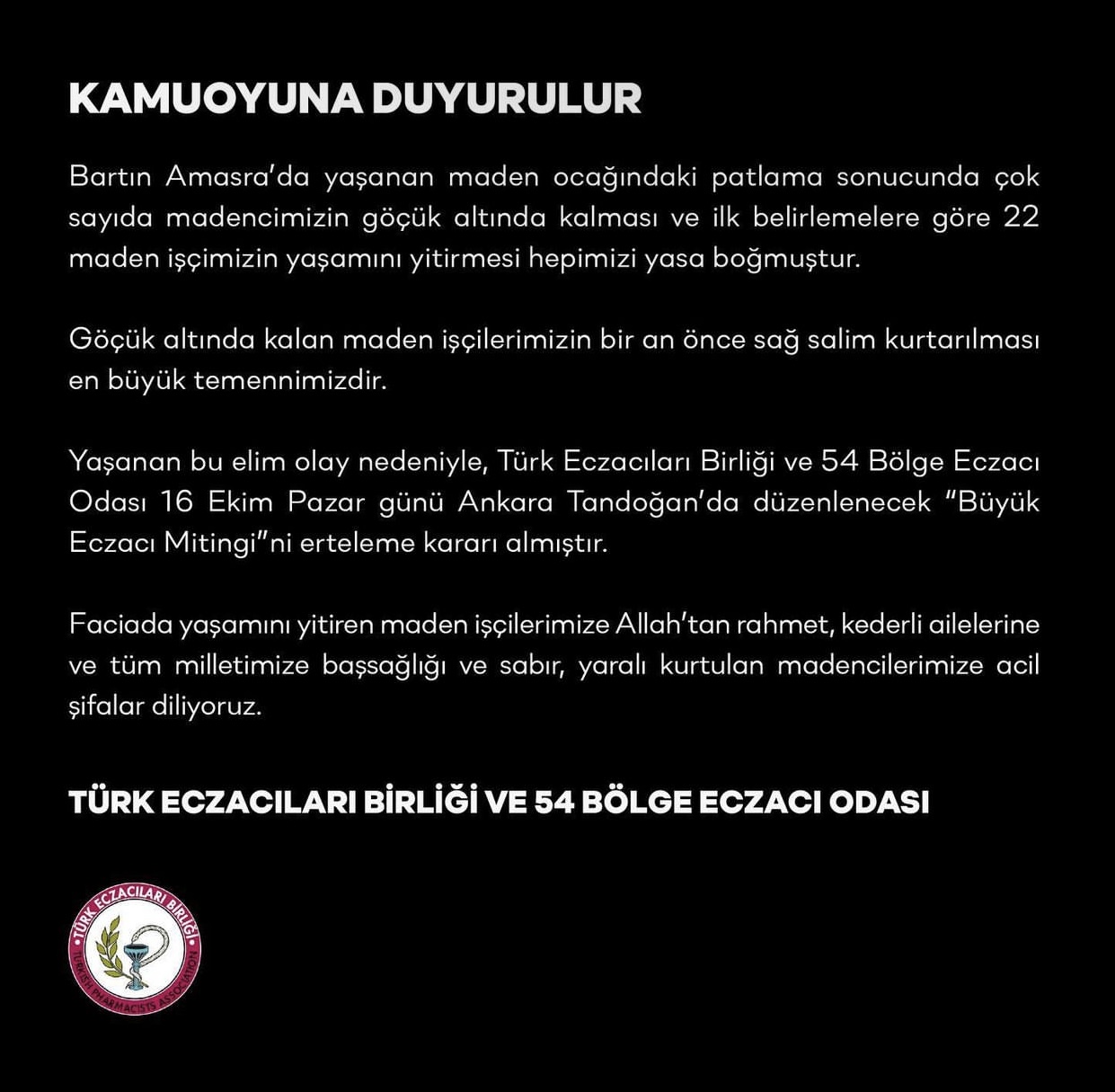 Yaşanan bu elim olay nedeniyle, Türk Eczacıları Birliği ve 54 Bölge Eczacı Odası 16 Ekim Pazar günü Ankara Tandoğan'da düzenlenecek “Büyük Eczacı Mitingi”ni erteleme kararı almıştır.