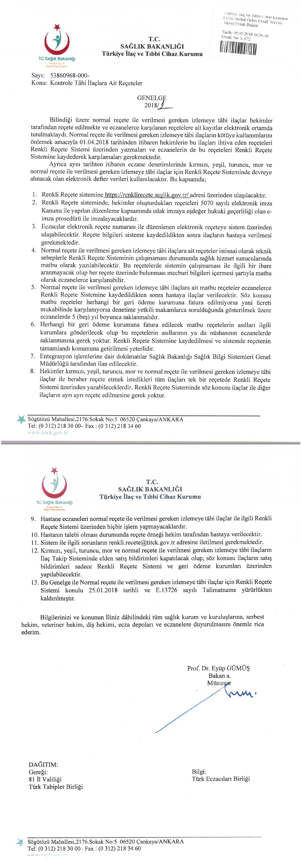 Konu hakkında TİTCK Başkanlığı tarafından 06.03.2018 tarihinde Kurumun internet sayfasında yayımlanan “Normal Reçete ile Verilmesi Gereken İzlemeye Tabi İlaçların Renkli Reçete Sistemi Üzerinden Yazılması Hakkında” başlıklı duyuru ile, 05/03/2018 tarihli ve E.672 sayılı 2018/1 sayılı Genelge gereği normal reçete ile verilmesi gereken izlemeye tabi ilaçlar 01/04/2018 tarihinden itibaren Renkli Reçete Sistemi üzerinden yazılacaktır.” denilmektedir.