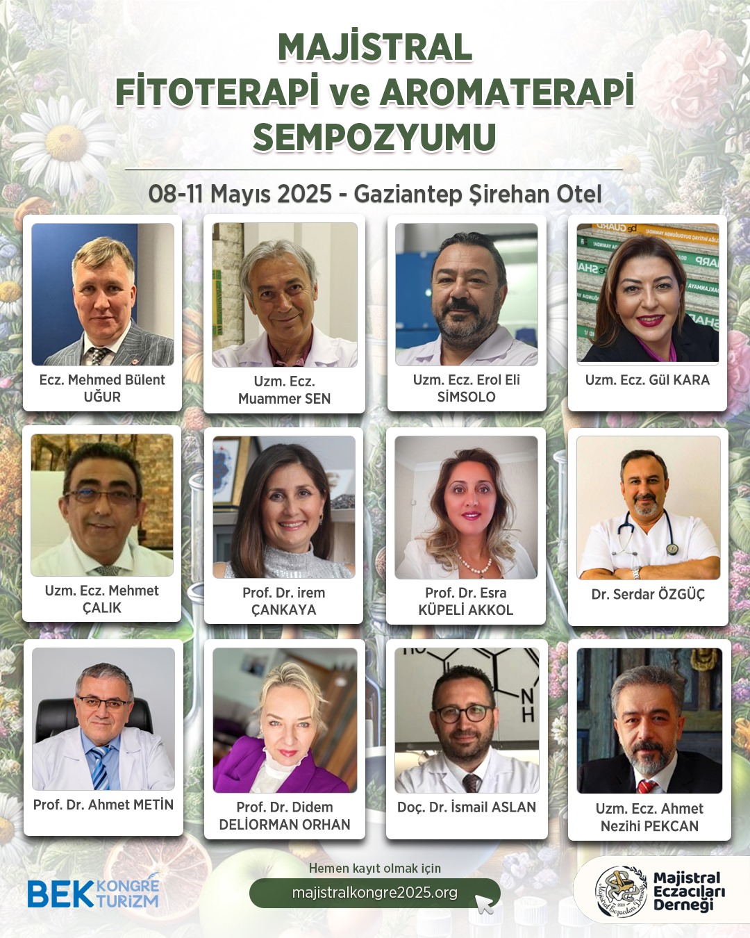 Majistral Eczacılar Derneği tarafından düzenlenen ve alanında uzman bir çok konuşmacının katılacağı "Majistral Fitoterapi ve Aromaterapi Sempozyumu" 8-11 Mayıs 2025 tarihleri arasında Gaziantep Şirehan Otel'de gerçekleştirilecektir. Detaylı bilgi ve sempozyuma kayıt olmak için majistralkongre2025.org web sitesini ziyaret edebilirsiniz.