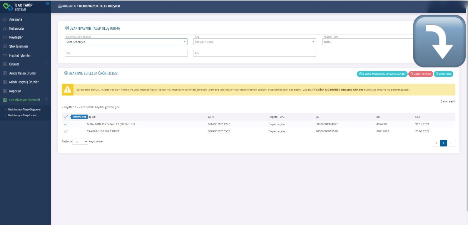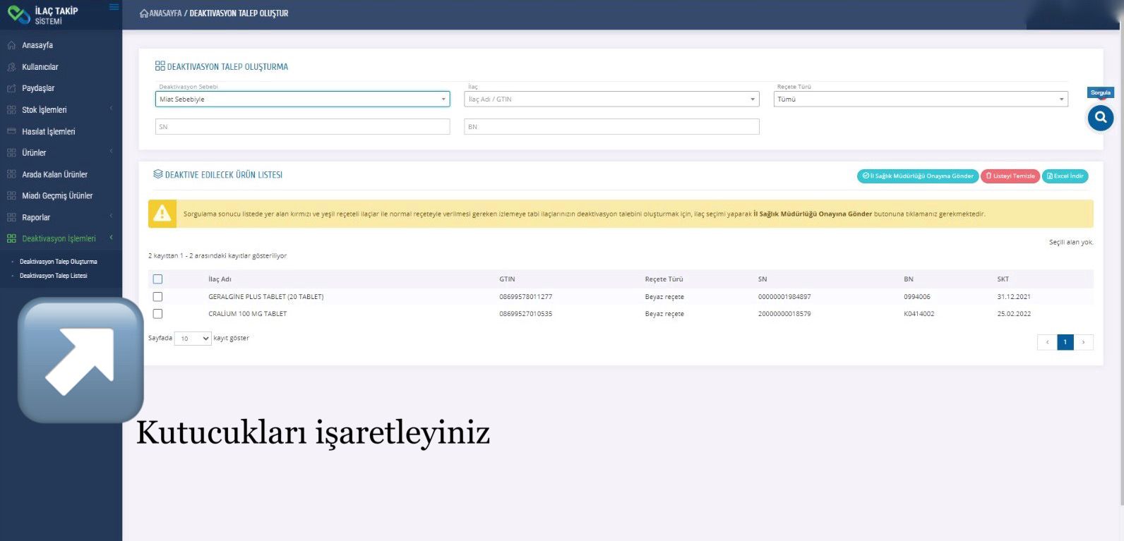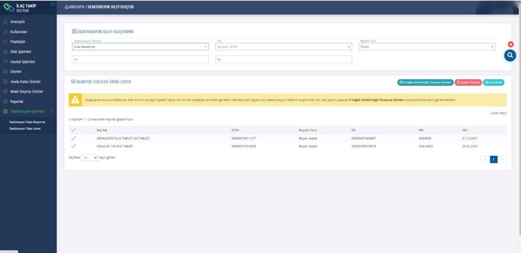 Miadı geçmiş Kontrole Tabi ilaçların imhası için ITS Portalda Deaktivasyon işlemleri menüsünden Deaktivasyon Talep Oluşturma Alt Menüsünden Seçim yapılması Excel İndir Bölümünden karekodlu ilaç listesi indirilmesi ve listenin İl Sağlık Müdürlüğü onayına sunulması neticesinde İlçe Sağlık Müdürlüğü'ne bilgi verilmesi gerekmektedir. İlçe Sağlık Müdürlüğü onayı sonrasında Odamıza bilgi verilmesi durumunda imha için Miadı geçmiş Kontrole Tabi ilaçlar personelimiz tarafından teslim alınacaktır.