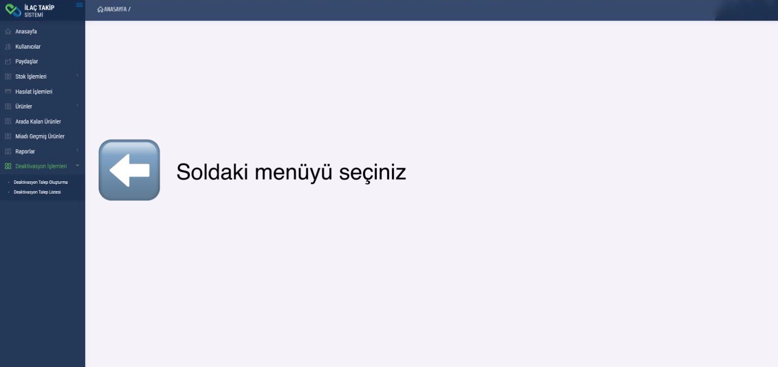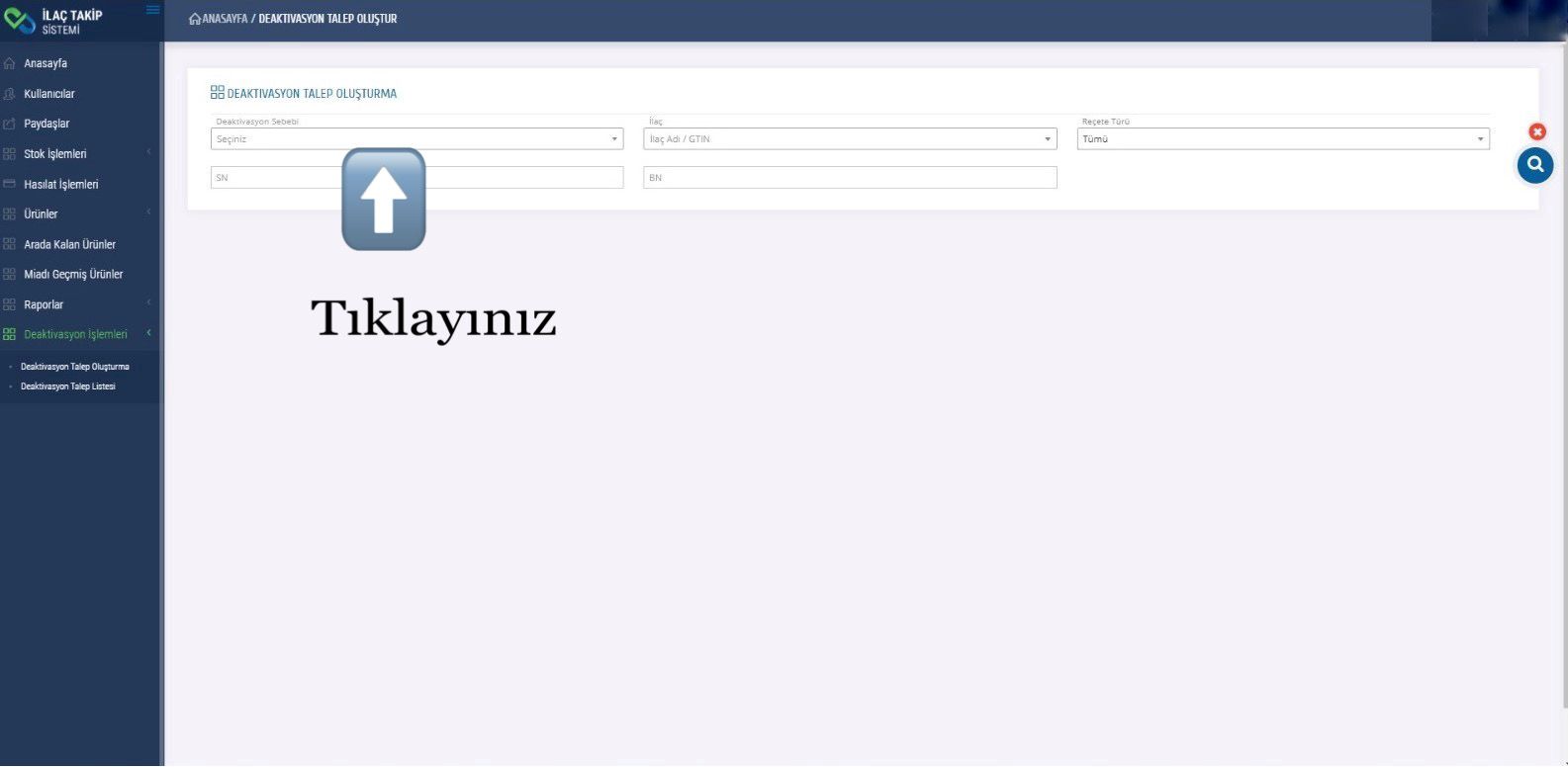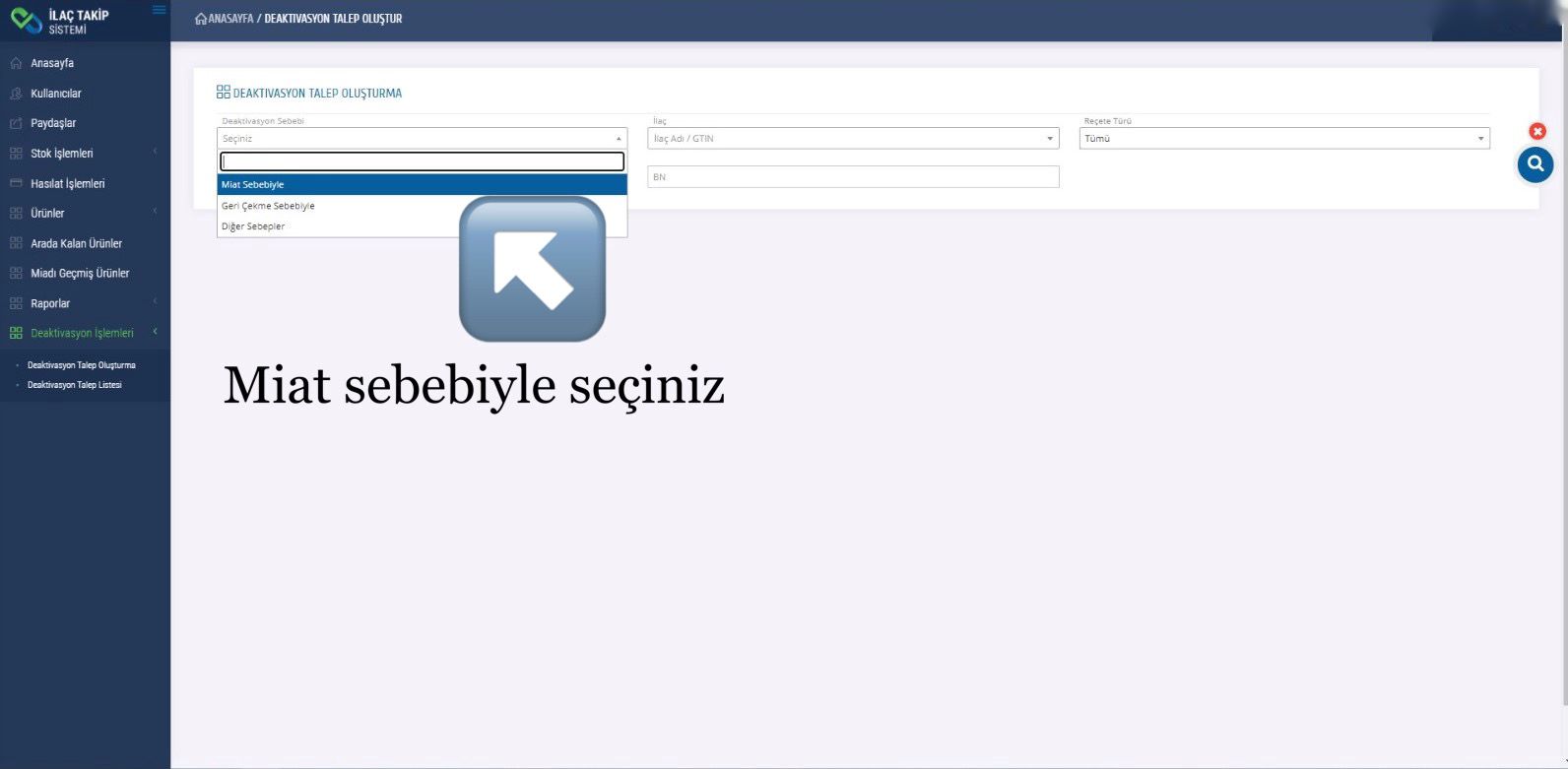 Miadı geçmiş Kontrole Tabi ilaçların imhası için ITS Portalda Deaktivasyon işlemleri menüsünden Deaktivasyon Talep Oluşturma Alt Menüsünden Seçim yapılması Excel İndir Bölümünden karekodlu ilaç listesi indirilmesi ve listenin İl Sağlık Müdürlüğü onayına sunulması neticesinde İlçe Sağlık Müdürlüğü'ne bilgi verilmesi gerekmektedir. İlçe Sağlık Müdürlüğü onayı sonrasında Odamıza bilgi verilmesi durumunda imha için Miadı geçmiş Kontrole Tabi ilaçlar personelimiz tarafından teslim alınacaktır.