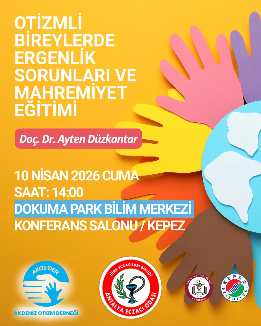 Antalya Eczacı Odası ve Akdeniz Otizm Derneği iş birliği ile gerçekleştirilecek olan bu eğitimde, Doç. Dr. Ayten Düzkantar, "Otizmli Bireylerde Ergenlik Sorunları ve Mahremiyet Eğitimi" başlığı altında bilgi ve deneyimlerini bizlerle paylaşacak.