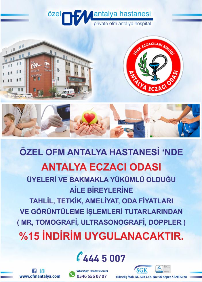 Özel Antalya OFM Hastanesi ile Odamız arasında protokol imzalanmış olup, üyelerimiz, 1.derece yakınları (anne, baba, eş ve çocuk) ve eczane teknisyenlerimiz aşağıda detayları yer alan sağlık hizmetlerinden %15 oranında indirimden yararlanabileceklerdir.