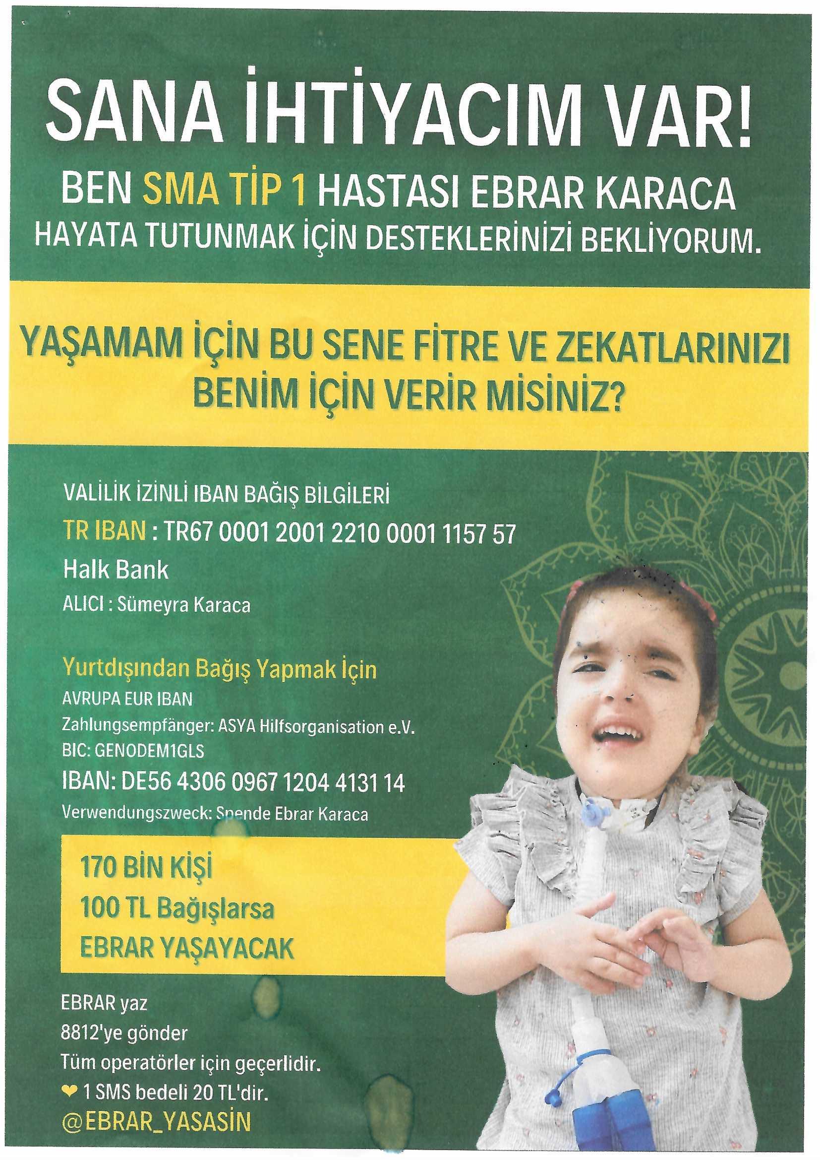Odamıza, SMA Tip 1 hastası EBRAR KARACA için Antalya Valiliği'nin izni ile yardım kampanyası başlatıldığı bildirilmiştir.