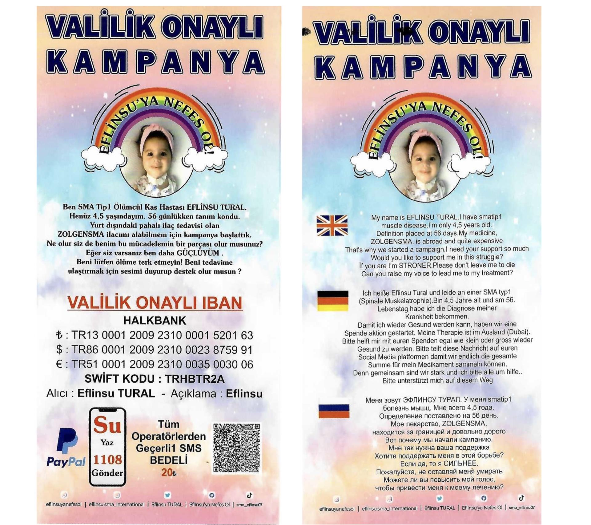 Odamıza, SMA Tip 1 hastası EFLİNSU TURAL için Antalya Valiliği'nin izni ile yardım kampanyası başlatıldığı bildirilmiştir.