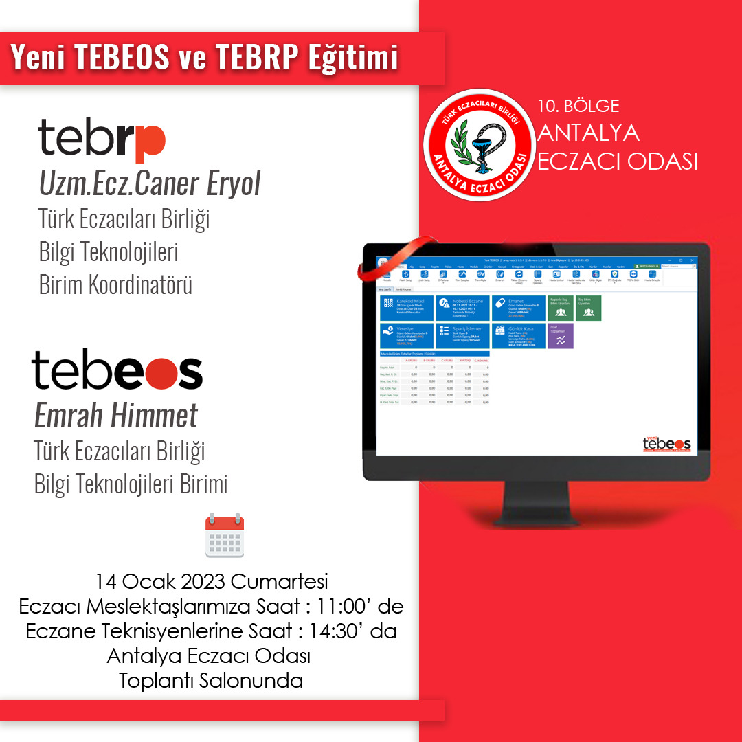 Türk Eczacıları Birliği tarafından hizmete sunulan TEBEOS VE TEBRP'nin yeni sürümleriyle ilgili 14 Ocak 2023 Cumartesi günü Meltem Şube Toplantı Salonumuzda Eczacılarımıza saat 11.00'da, Eczane Çalışanlarımıza ise saat 14:30'da olmak üzere TEB Bilgi Teknolojilerinden Birim Koordinatörü Uzm. Ecz. Caner ERYOL ve aynı birimden Emrah HİMMET tarafından eğitim ve tanıtım toplantısı düzenlenecektir.