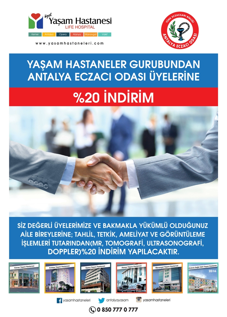Özel Yaşam Hastanesi ve Antalya Eczacı Odası arasında yapılan anlaşmaya istinaden, oda üyelerimize ve birinci derece yakınlarına sağlık hizmetleri üzerinden %20, Check-Up planlarında %25 oranında indirim uygulanacaktır.