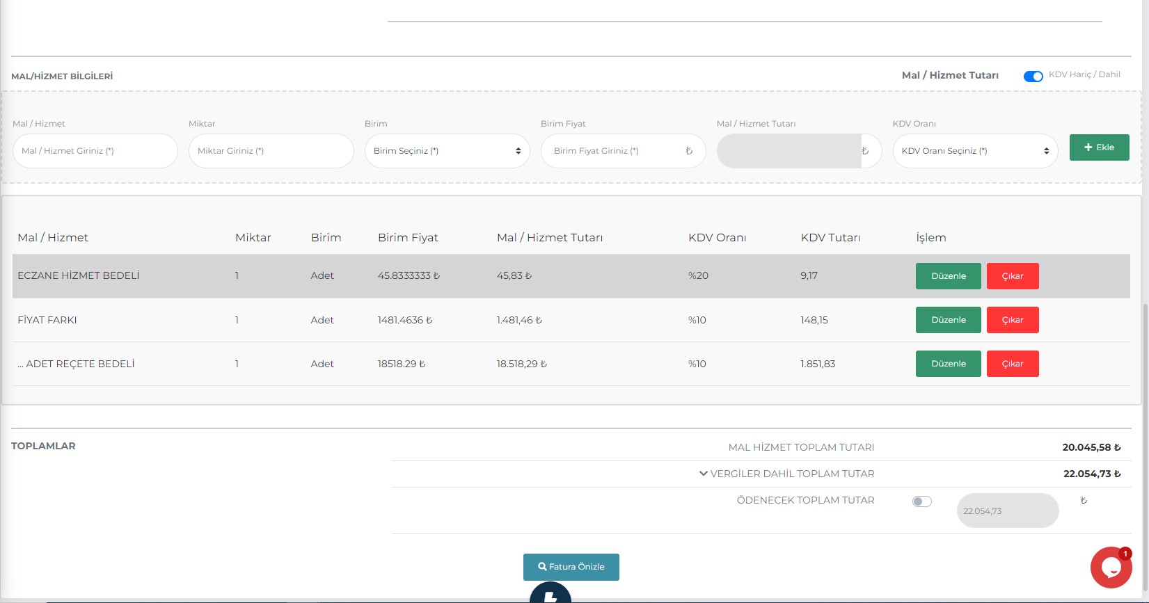 Kurum tarafından onaylanmış olan fatura örneğinde olduğu gibi kdv oranları ve mal-hizmet kısmı dikkate alınarak ECZ-FATURA 'da manuel olarak düzenlenip fatura edilir.