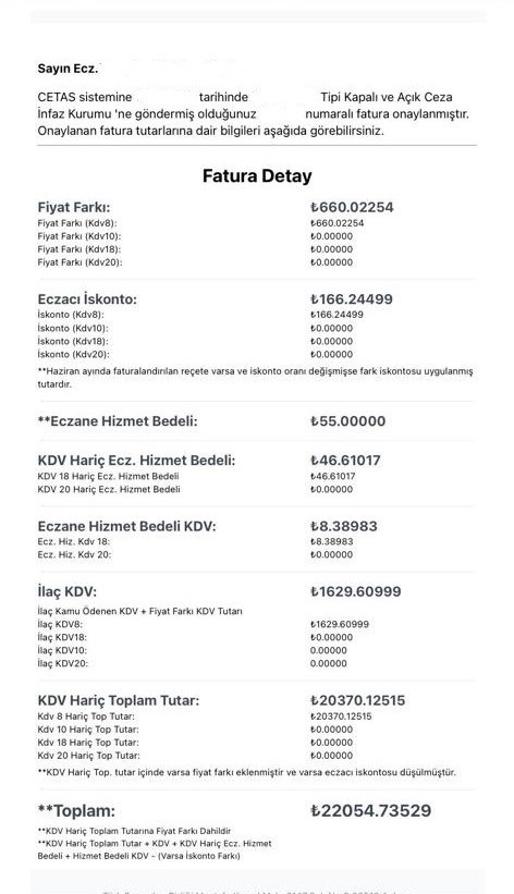Cetas Sistemine Cezaevi tarafından e-mail yolu ile gönderilen onaylı fatura örneği;