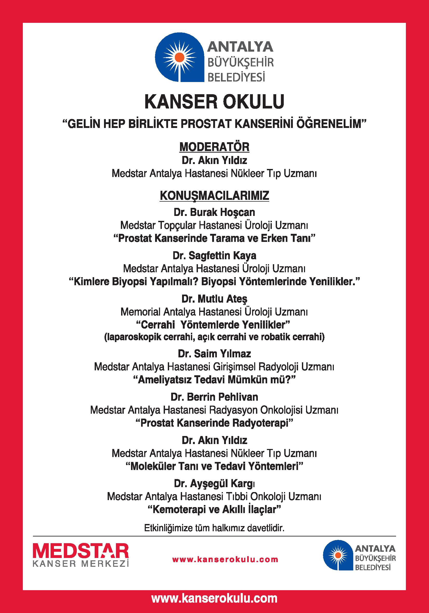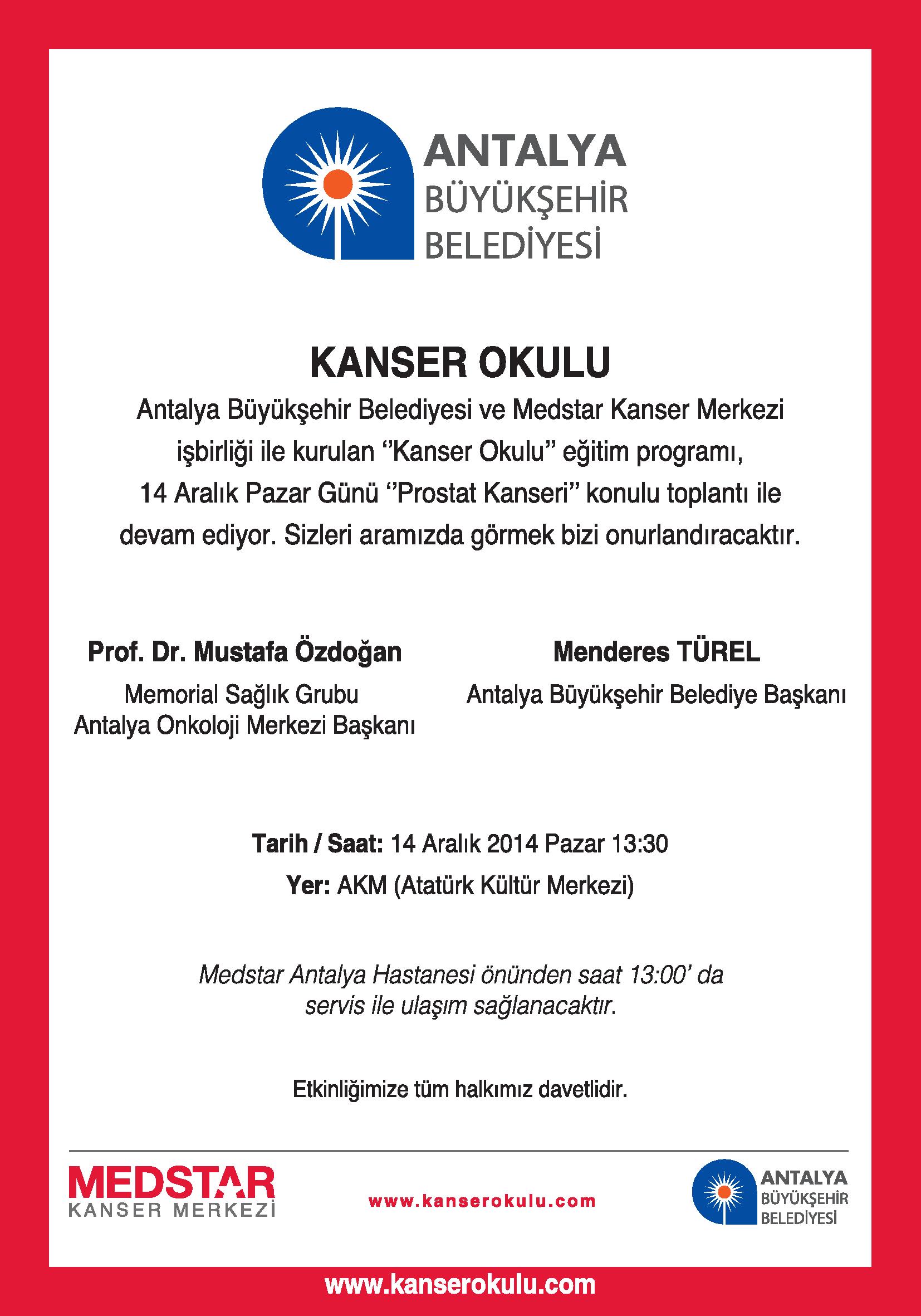 14 ARALIK 2014 PAZAR GÜNÜ SAAT 13:30 AKM (ATATÜRK KÜLTÜR MERKEZİ) DE ANTALYA BÜYÜKŞEHİR BELEDİYESİ VE MEDSTAR KANSER MERKEZİ İŞBİRLİĞİ İLE DÜZENLENEN PROSTAT KANSERİ KONULU TOPLANTIYA TÜM MESLEKTAŞLARIMIZ DAVETLİDİR.